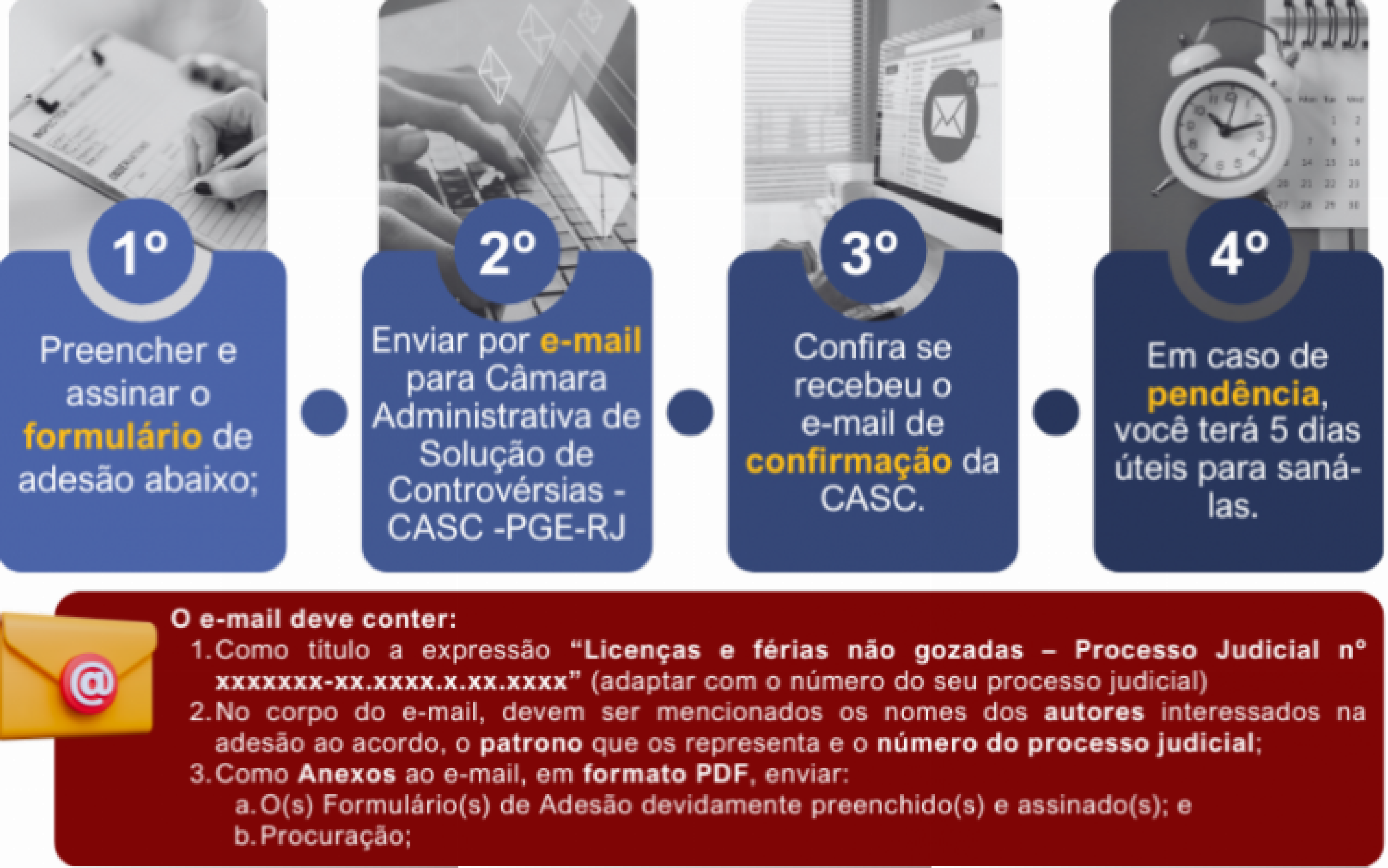 A adesão ao acordo pode ser feita dentro de 30 (trinta) dias úteis contados da data em que você foi intimado, por despacho da 3ª Vice-Presidência do Tribunal de Justiça do Rio de Janeiro no processo judicial, a se manifestar sobre a proposta de acordo oferecida na petição da PGE-RJ.