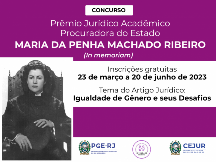 A Procuradoria ia Geral do Estado do Rio de Janeiro (PGE-RJ) publicou, nesta quinta-feira (23/03), o edital que cria o concurso jurídico acadêmico “Procuradora Maria da Penha Machado Ribeiro” com o objetivo de premiar os melhores trabalhos jurídicos de graduados e graduandos sobre “igualdade de gênero e seus desafios”.