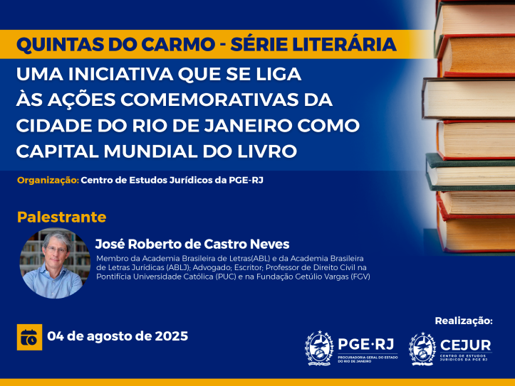 Estão abertas as inscrições para o próximo evento da série “Quintas do Carmo”, que será realizado no dia 4 de agosto de 2025, a partir das 11h, no Centro Cultural PGE-RJ (Rua Primeiro de Março, s/nº, Praça XV, Centro, RJ). O encontro contará com a participação do membro da Academia Brasileira de Letras, advogado, escritor e professor da PUC-Rio e da FGV, José Roberto de Castro Neves.