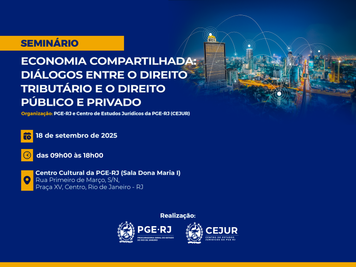 Estão abertas as inscrições para o seminário “Economia Compartilhada: Diálogos entre o Direito Tributário e o Direito Público e Privado”, que será realizado no dia 18 de setembro de 2025, das 9h às 18h, no Centro Cultural PGE-RJ – Sala Dona Maria I (Rua Primeiro de Março, s/nº, Praça XV, Centro, Rio de Janeiro).