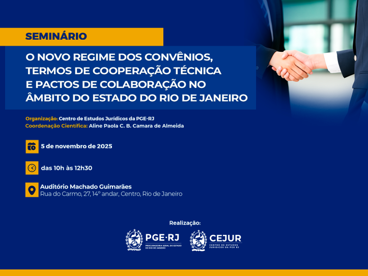 Estão abertas as inscrições para o Seminário “O novo regime dos convênios, termos de cooperação técnica e pactos de colaboração no âmbito do Estado do Rio de Janeiro”, promovido pela Procuradoria Geral do Estado do Rio de Janeiro (PGE-RJ).