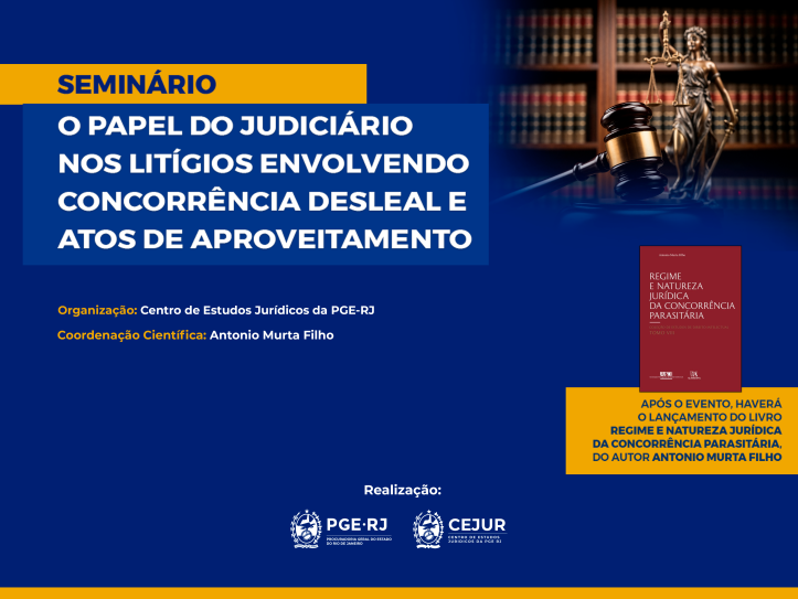 Estão abertas as inscrições para o seminário “O Papel do Judiciário nos Litígios Envolvendo Concorrência Desleal e Atos de Aproveitamento”, que será realizado no dia 13 de agosto de 2025, às 17h, no Centro Cultural da PGE-RJ – Sala Dona Maria I (Rua Primeiro de Março, s/nº, Praça XV, Centro, RJ).