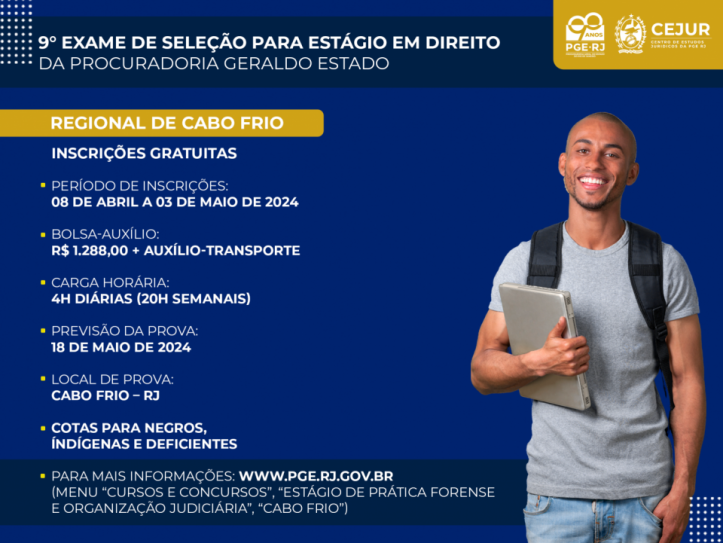 Inscreva-se em: https://pge.rj.gov.br/cursos-e-concursos/estagio-regiao/80-9-exame-cabo-frio