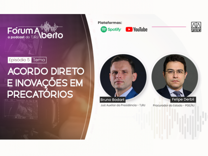 Já está disponível nas plataformas digitais o 5º episódio do podcast Fórum Aberto, um produto do Estúdio TJRJ. Desta vez, o juiz auxiliar da Presidência Bruno Bodart, gestor de precatórios do Tribunal de Justiça do Rio, e o procurador do Estado Felipe Derbli abordaram os esforços da Administração Pública para agilizar o pagamento de precatórios judiciais.