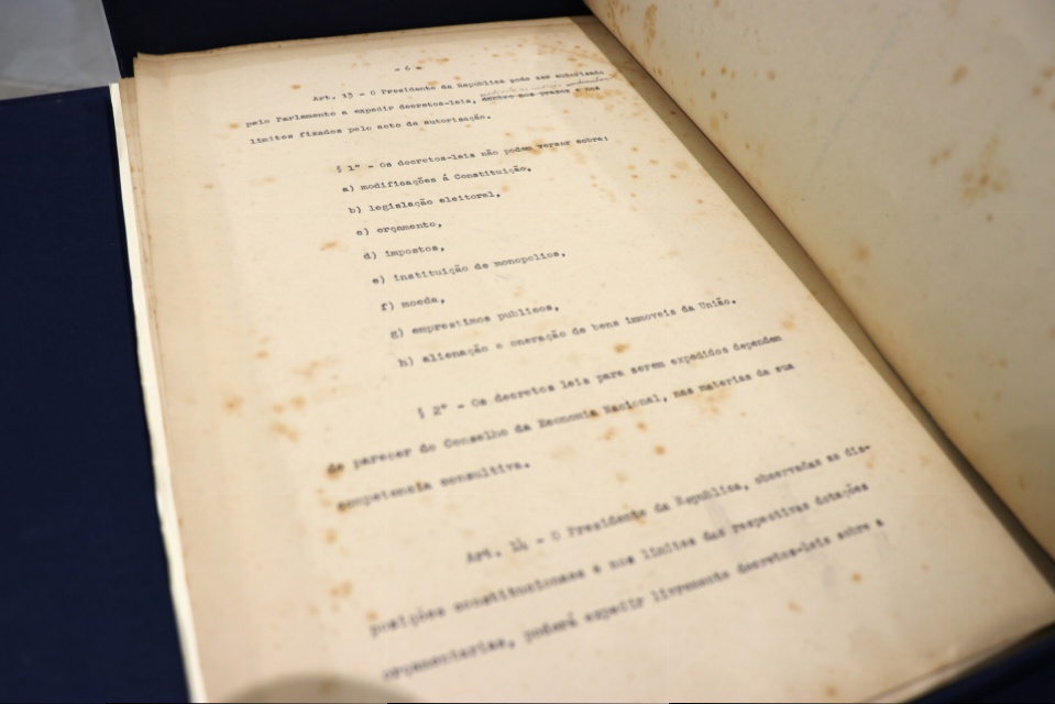 Constituição anotada por Francisco Campos, elaborada por volta de 1937 - Documento original e único, ainda em esboço, com anotações, rasuras e acréscimos textuais pelo jurista Francisco Campos, encarregado por Getúlio Vargas para elaborar a Constituição de 1937.