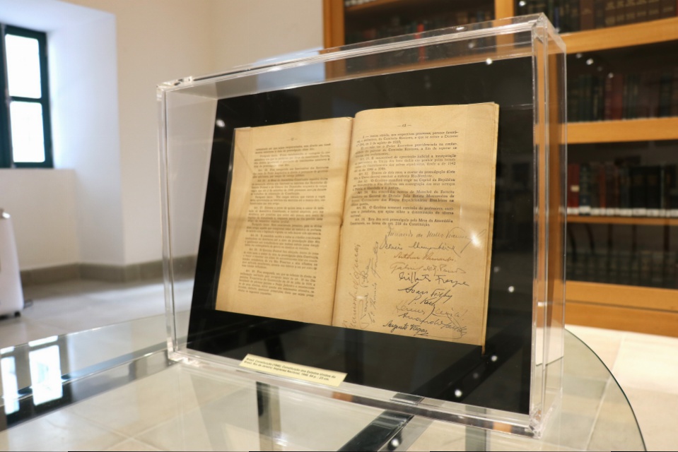 Constituição dos Estados Unidos do Brasil, publicada pela Imprensa Nacional em 1946 - Possui selo "Brasil correio Constituição de 1946" e Carimbo: "Palácio Tiradentes DF – Brasil. O exemplar contém as assinaturas originais dos constituintes da época.