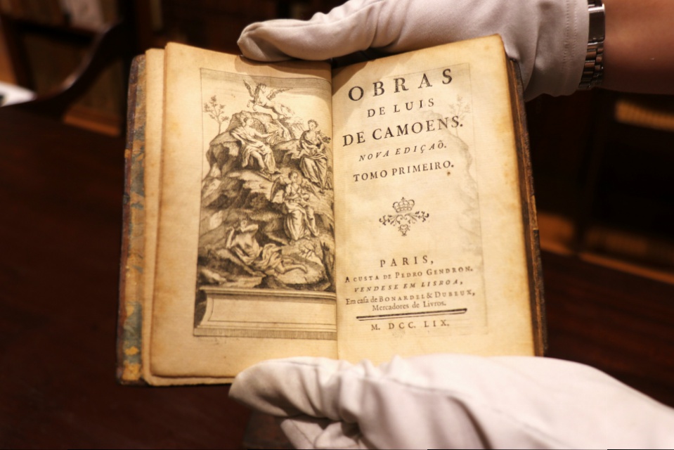 Obras de Luis de Camões, publicada em Paris, 1759 - Uma das edições mais antigas da Biblioteca, encadernada em couro, com gravuras e antigas anotações.