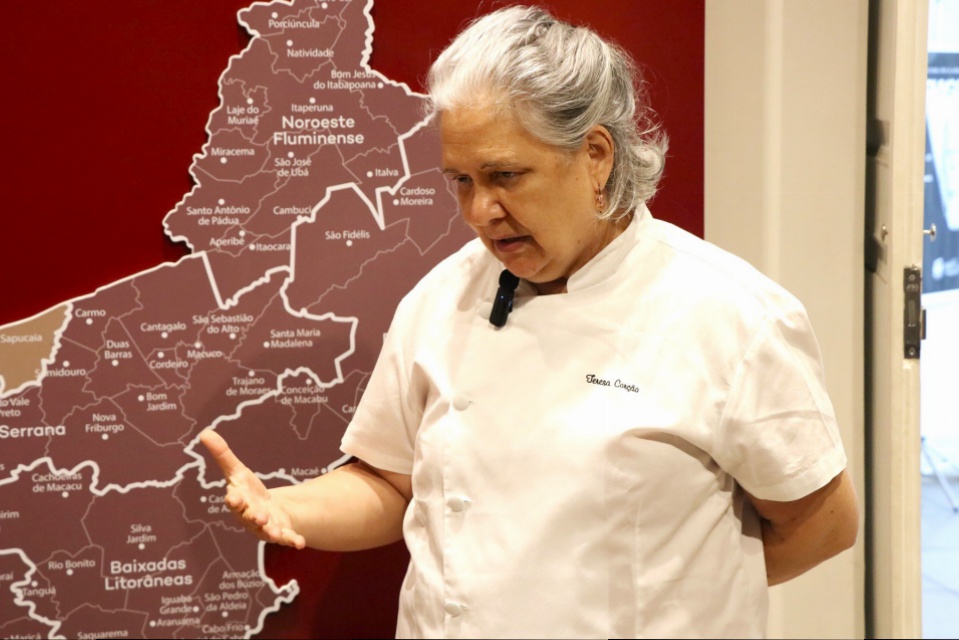 “As frutas, por exemplo, que são de outros estados elas não são colhidas maduras, portanto, elas não apresentam o melhor ponto de gosto que elas têm”, afirmou Teresa Corção para os alunos, ressaltando a importância da proposta do bistrô, de mapear a produção da agricultura familiar do interior do estado para encurtar a distância entre fornecedor e consumidor e garantir o melhor sabor para o prato do bistrô.