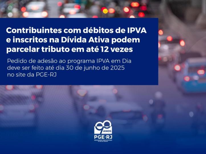 A Procuradoria Geral do Estado do Rio de Janeiro (PFGE-RJ) informa que os contribuintes com débitos relativos ao Imposto sobre Veículos Automotores (IPVA) dos anos de 2020, 2021, 2022, 2023 e 2024 já podem aderir ao programa IPVA em Dia. O pedido de adesão deve ser feito até o dia 30 de junho de 2025 no endereço www.pge.rj.gov.br/divida-ativa.
