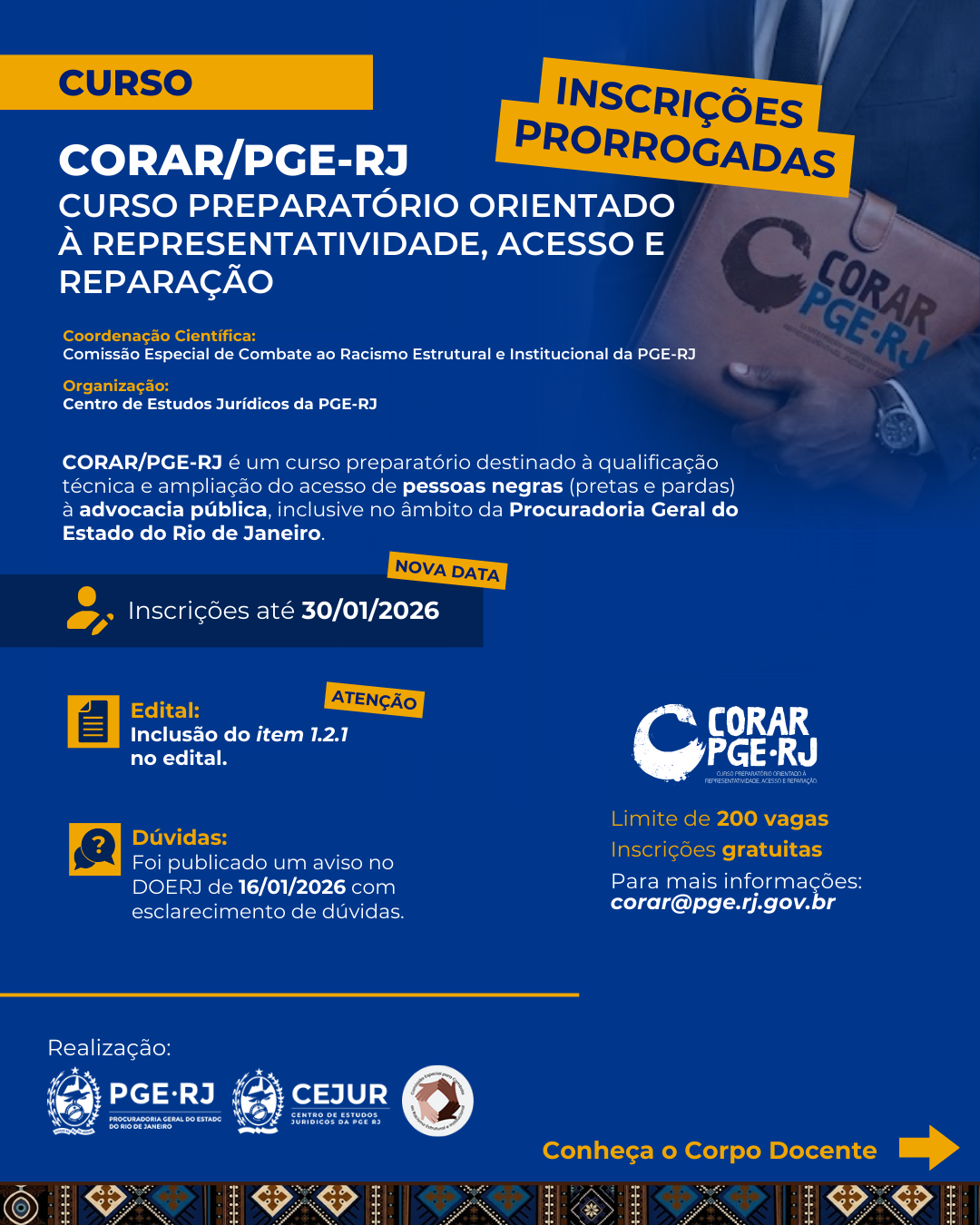 As inscrições para o Curso Preparatório Orientado à Representatividade, Acesso e Reparação, uma iniciativa da Procuradoria Geral do Estado do Rio de Janeiro, por meio da Comissão Especial de Combate ao Racismo Estrutural e Institucional e do Centro de Estudos Jurídicos, foram prorrogadas até 30 de janeiro. Além disso, foi incluído o item 1.2.1, que esclarece que as alíneas do item 1.2 são de cunho meramente classificatório, conforme item 1.1 do edital (publicação de hoje no DOERJ).