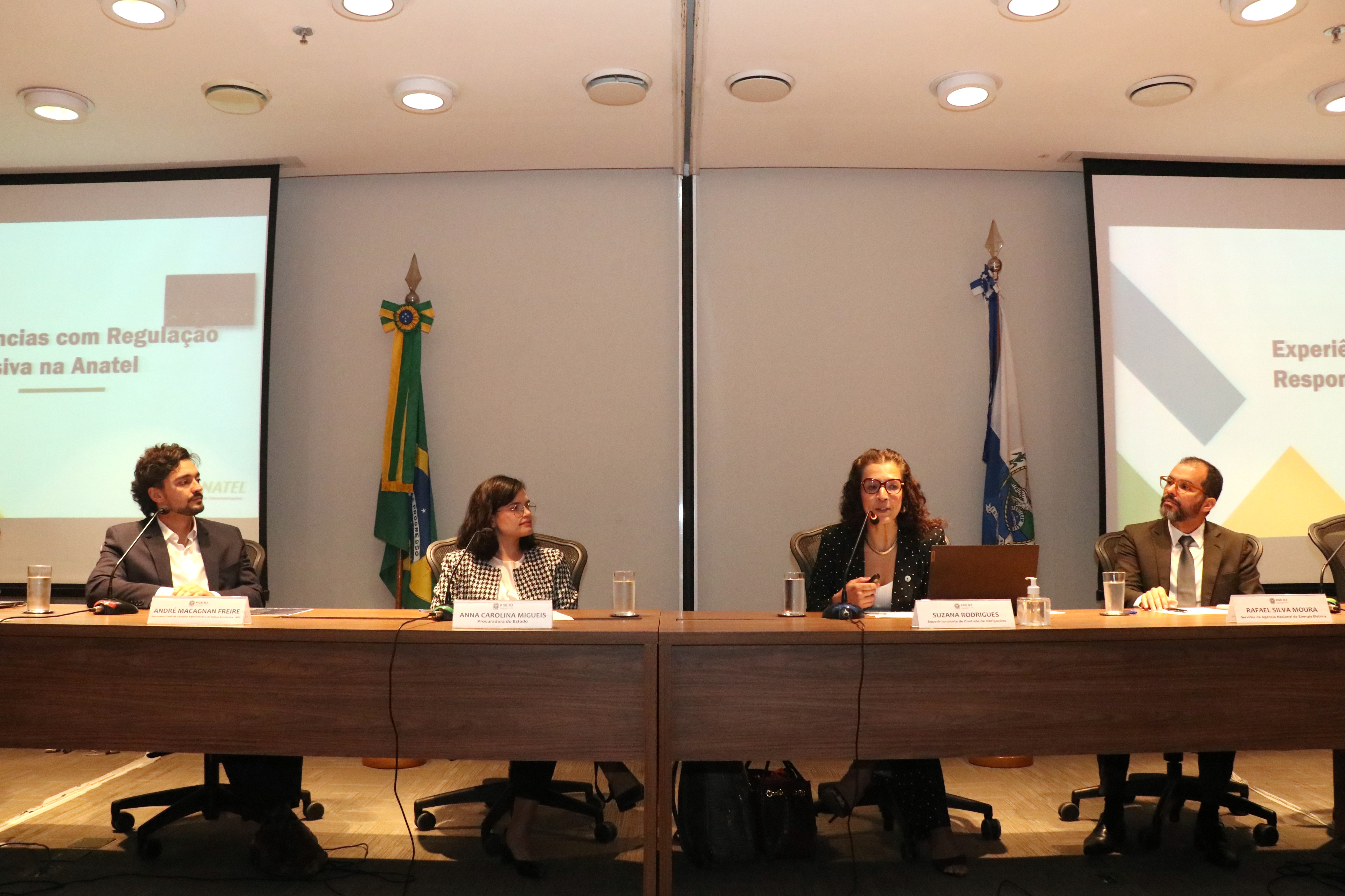 Já o Painel 2 - "Experiências com Regulação Responsiva: ANATEL, ANEEL e ANTT" - teve como debatedora a Procuradora Anna Migueis e as palestras da Superintendente de Controle de Obrigações da ANATEL, Suzana Rodrigues; do Servidor da ANEEL, Rafael Silva Moura; e do Procurador-Chefe do Conselho Administrativo de Defesa Econômica da Advocacia Geral da União (AGU), André Macagnan Freire.