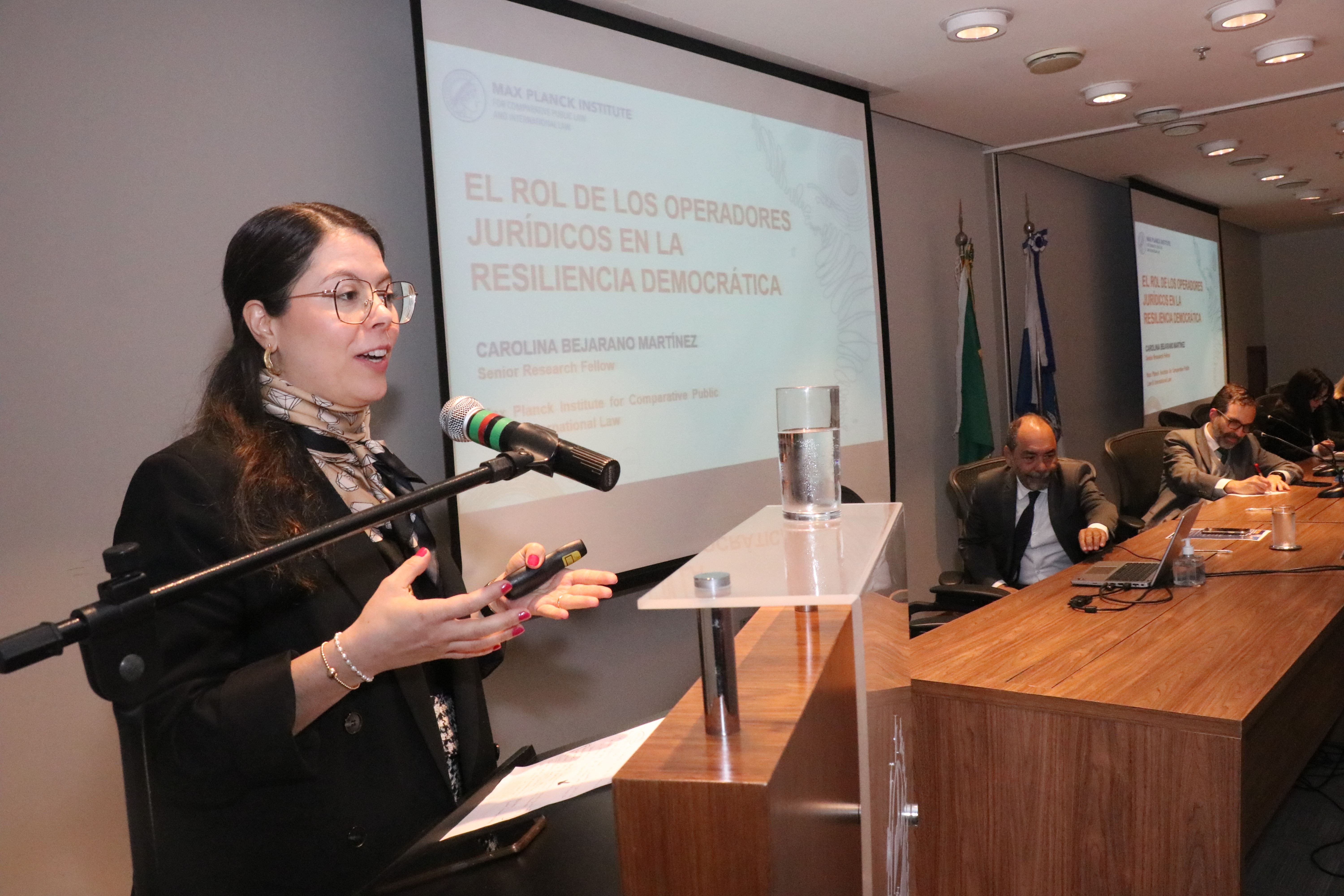 Em seguida, a também Representante para a América Latina e Investigadora Senior do Instituto Max Planck de Direito Público Comparado e Internacional, Carolina Bejarano, apresentou a palestra "O Papel dos Operadores do Direito em Matéria de Resiliência Democrática à Luz do ICCAL", que teve como debatedor o Procurador da Fazenda Nacional e Diretor-Geral da Escola Superior da Advocacia-Geral da União (ESAGU), João Carlos Souto.