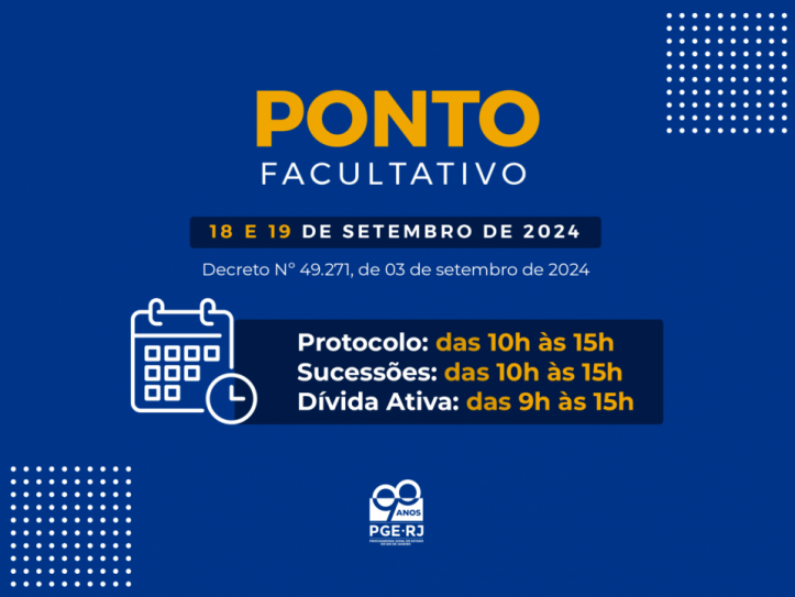 Em virtude do Decreto Nº 49.271, de 3 de setembro de 2024, que estabelece ponto facultativo nos dias 18 e 19 deste mês, haverá mudanças nos horários de atendimento ao público na Procuradoria Geral do Estado do Rio de Janeiro (PGE-RJ).
