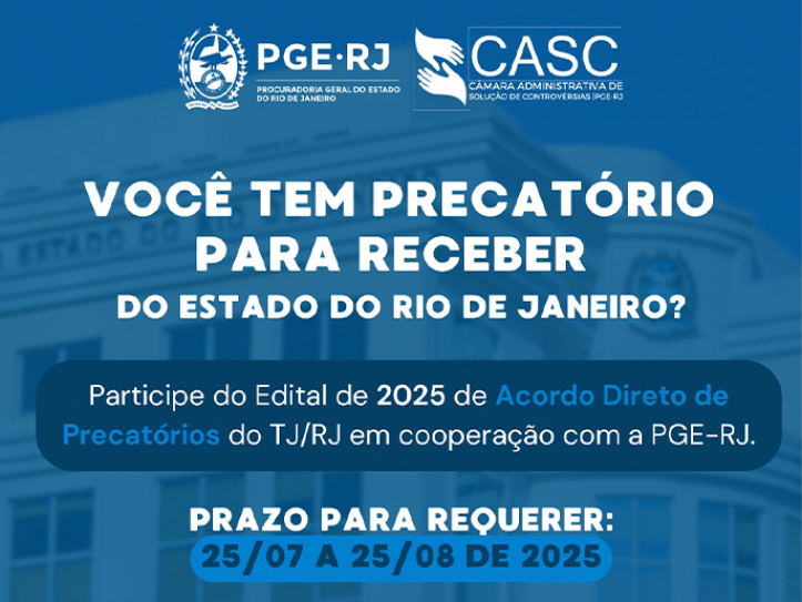 Por força do Edital n. 1/2025 da Presidência do TJRJ, os interessados poderão fazer o pedido de adesão entre 25 de julho e 25 de agosto no site da Procuradoria Geral do Estado do Rio de Janeiro (PGE-RJ) – https://pge.rj.gov.br/acordo-direto-de-precatorios. A iniciativa possibilita aos cidadãos o adiantamento do pagamento de seus créditos mediante a aplicação de deságio.