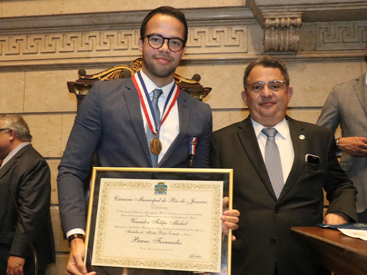 A Câmara Municipal do Rio de Janeiro concedeu nesta quarta-feira (17) a Medalha Pedro Ernesto ao Advogado e Professor Bruno Fernandes. A cerimônia foi realizada no plenário da Casa Legislativa e contou com a presença do Procurador-Geral do Estado, Renan Saad.