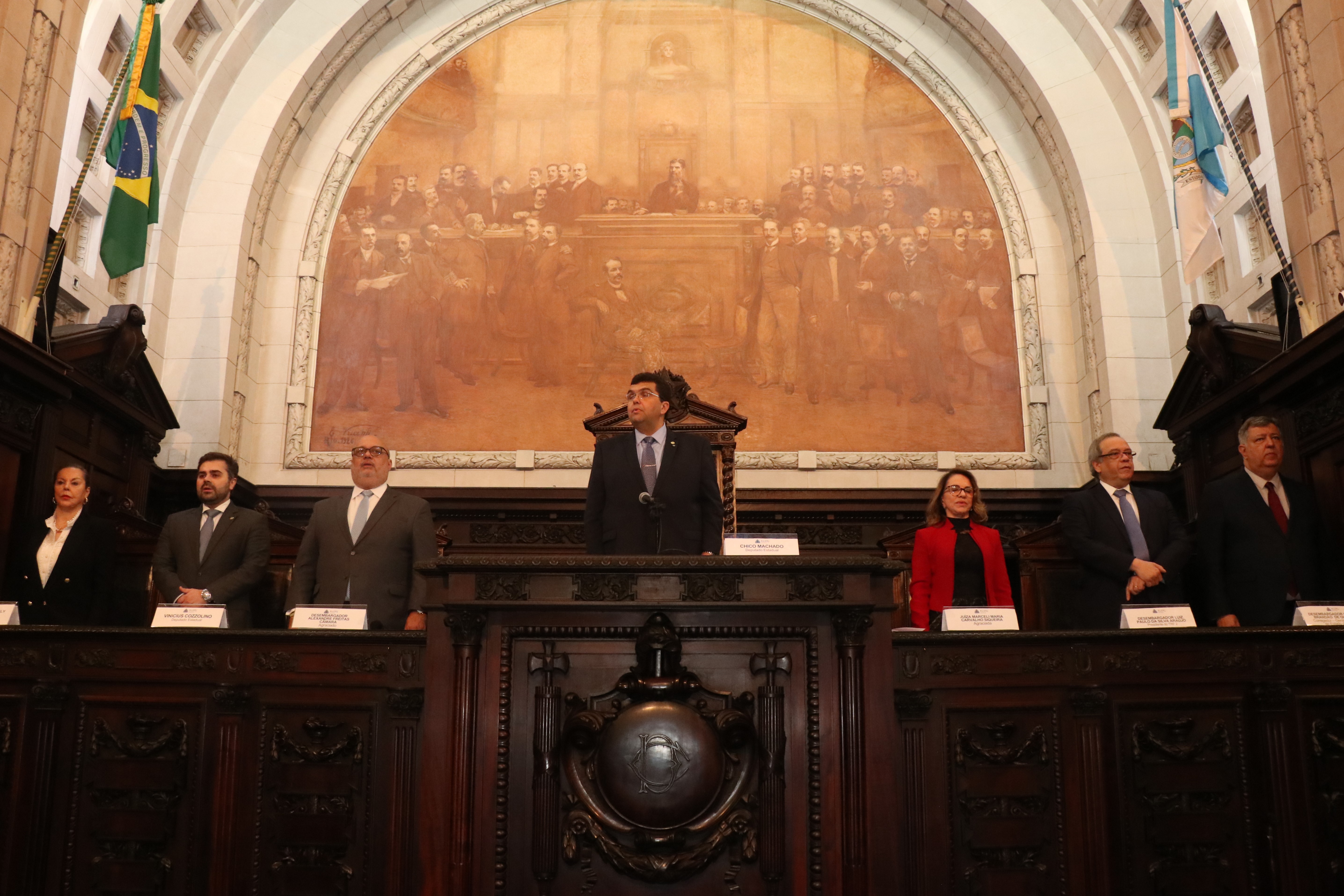 A mesa de honra teve as presenças do Presidente do TRF2, Desembargador Luiz Paulo da Silva Araújo Filho; da 1ª Vice-Presidente do TJRJ, Desembargadora Suely Magalhães, representando o Presidente da Corte, Desembargador Ricardo Couto de Castro; do Corregedor-Geral da Justiça do Estado do Rio de Janeiro, Desembargador Cláudio Brandão de Oliveira; e do Deputado Estadual Vinicius Cozzolino.
