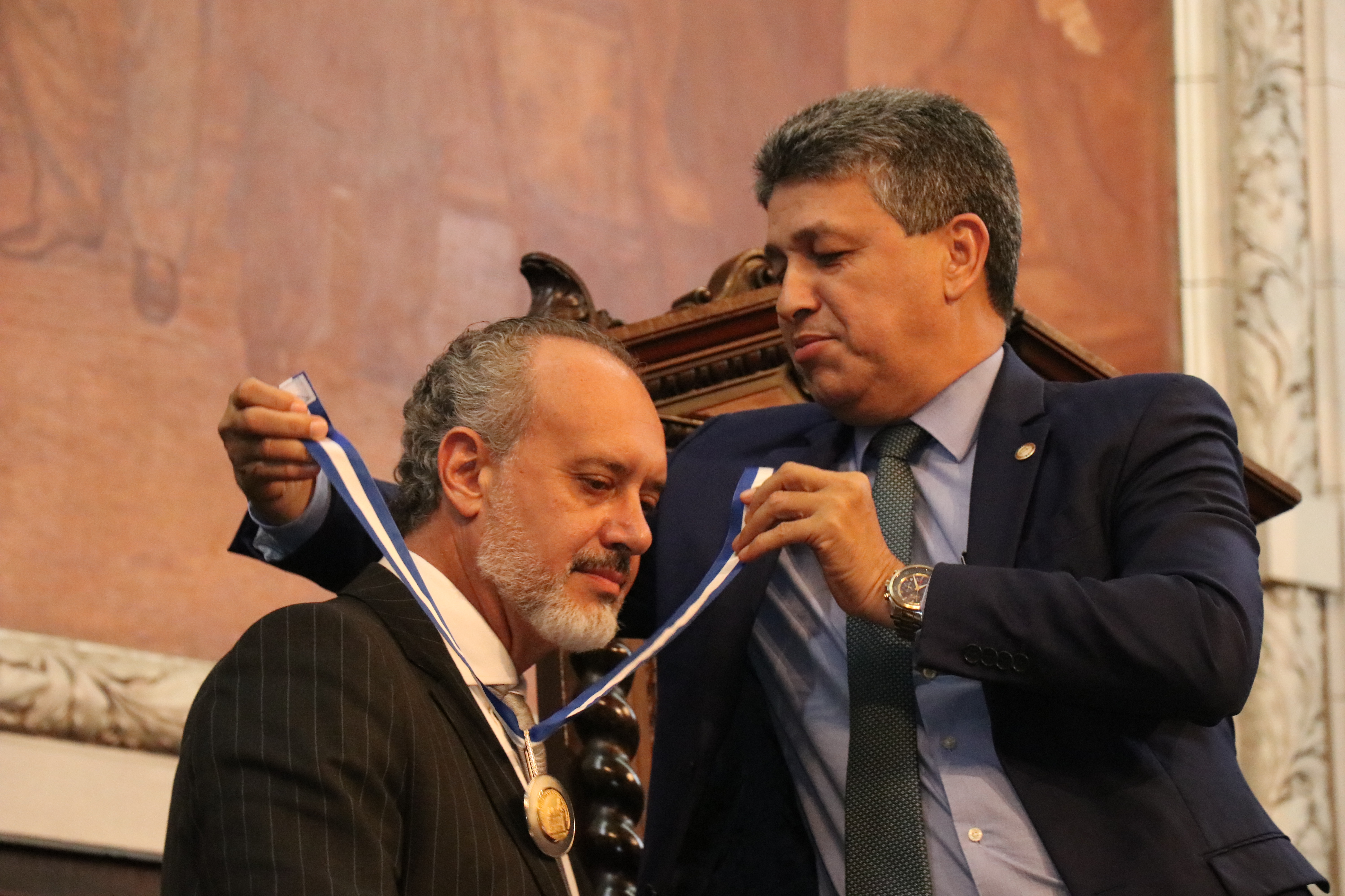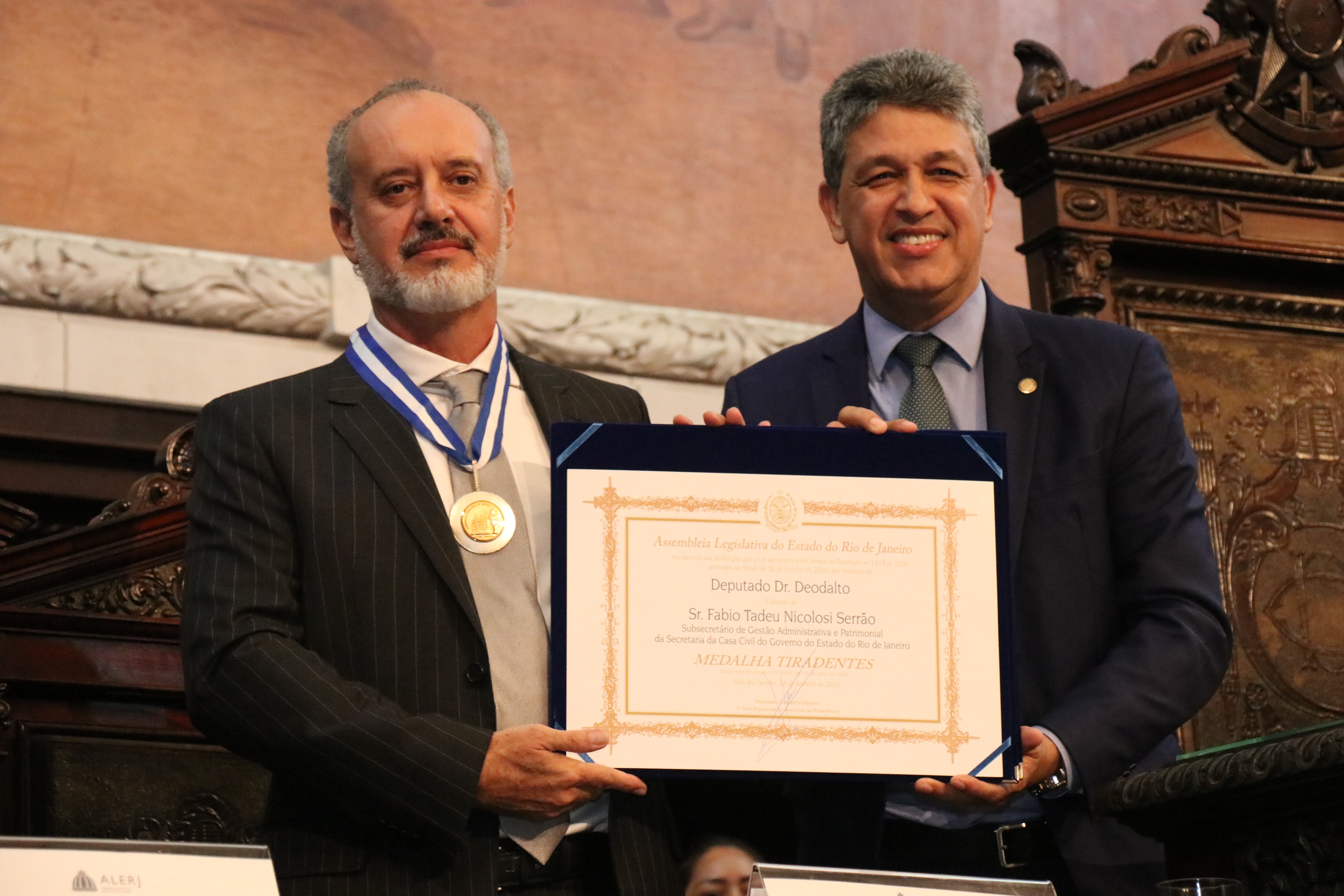 O Procurador-Geral do Estado, Renan Saad, participou, nesta quarta-feira (15), da sessão solene de entrega da Medalha Tiradentes ao Subsecretário de Gestão Administrativa e Patrimonial da Secretaria de Estado da Casa Civil, Fábio Serrão. A homenagem, maior honraria concedida pela ALERJ, ocorreu no Palácio Tiradentes por iniciativa do Deputado Doutor Deodalto.