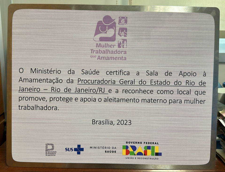 A sala de apoio à amamentação da PGE-RJ, inaugurada em maio de 2023 por iniciativa da Comissão de Gênero da PGE-RJ, recebeu certificação oficial do Ministério da Saúde como local que promove, protege e apoia o aleitamento materno para a mulher trabalhadora.