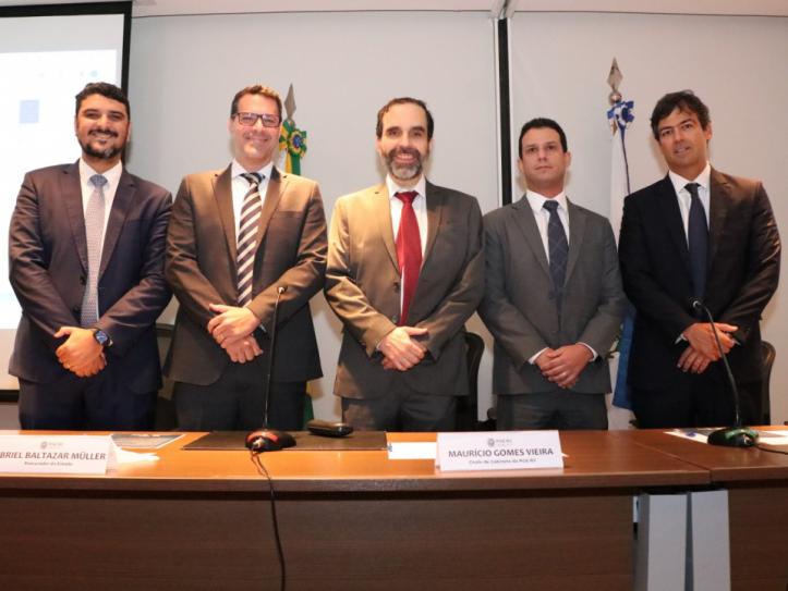 Compuseram a mesa que abriu o curso no auditório Machado Guimarães, na sede da PGE-RJ, o chefe de Gabinete, Procurador Maurício Gomes Vieira, o Procurador Carlos Edison do Rêgo Monteiro Filho, Chefe do Cejur, Rodrigo de Almeida Távora, Procurador-Assistente do Cejur, Procurador Gabriel Baltazar Müller, coordenador científico do curso, e o Procurador Marcelo Santini Brando, que ministrou a primeira aula, “Introdução à Nova Lei de Licitações e Contratos".