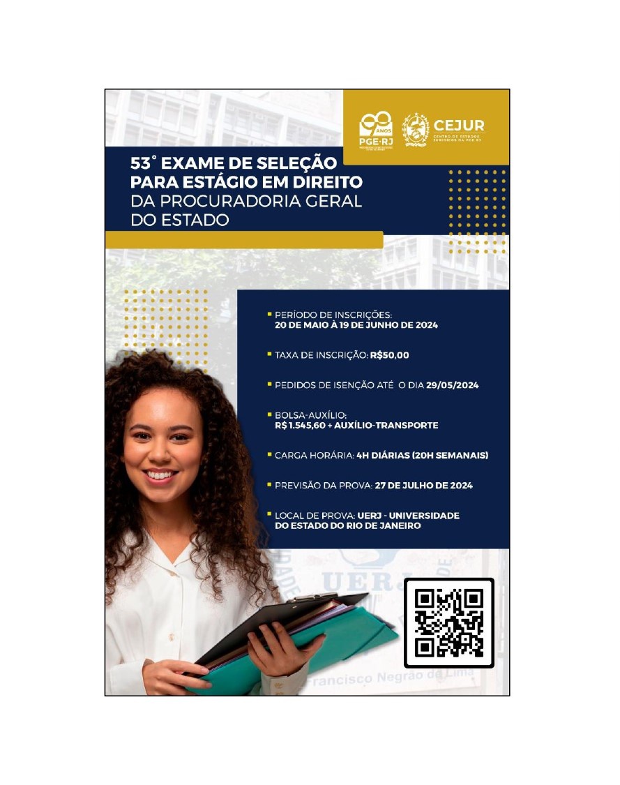 A Procuradoria Geral do Estado do Rio de Janeiro (PGE-RJ) levará informações sobre o 53º Exame de Seleção para Estágio em Direito e o Estágio de Prática Forense e Organização Judiciária.