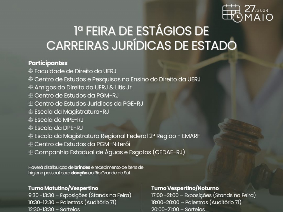 A solidariedade também marcará presença na 1ª Feira de Estágios de Carreiras Jurídicas de Estado. Para ajudar a população do Rio Grande do Sul, são bem-vindas as doações de itens de higiene pessoal, especialmente absorventes e fraldas, a serem encaminhados pela UERJ às vítimas daquele Estado.