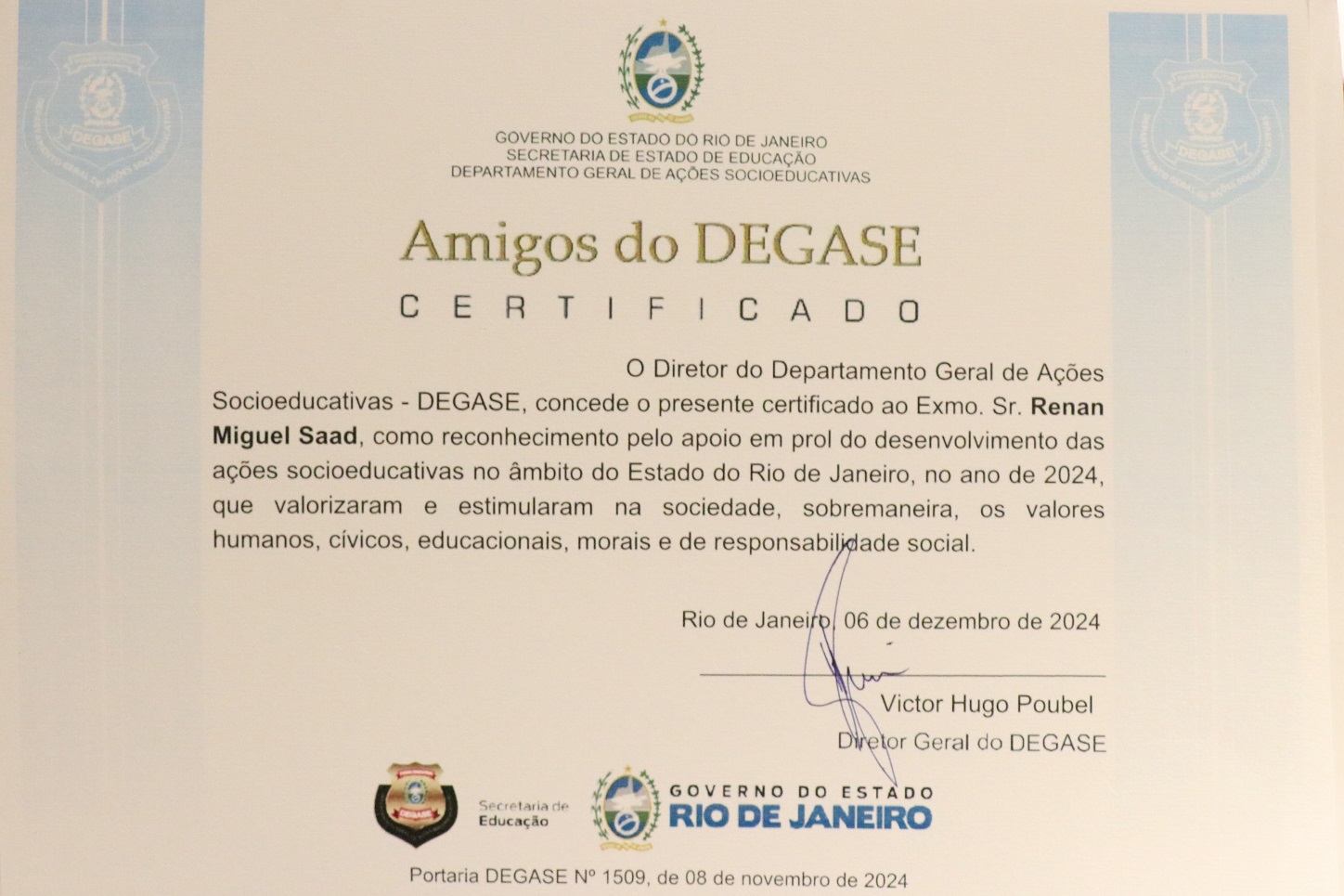 A abertura do evento foi feita por Victor Hugo Poubel, Diretor-geral do Degase, e pelo Procurador Raul Teixeira. A premiação tem como objetivo reconhecer o trabalho daqueles que prestaram serviços relevantes para a melhoria e o fortalecimento do Degase ao longo do ano de 2024. A cerimônia reuniu autoridades e representantes de instituições parceiras do órgão que também foram agraciados com a medalha.