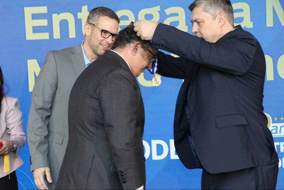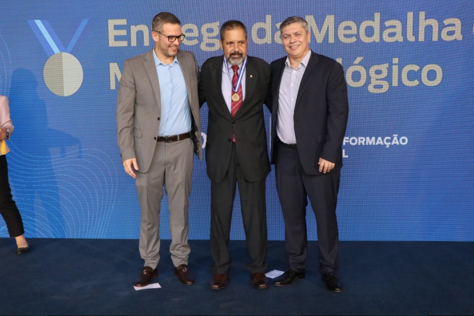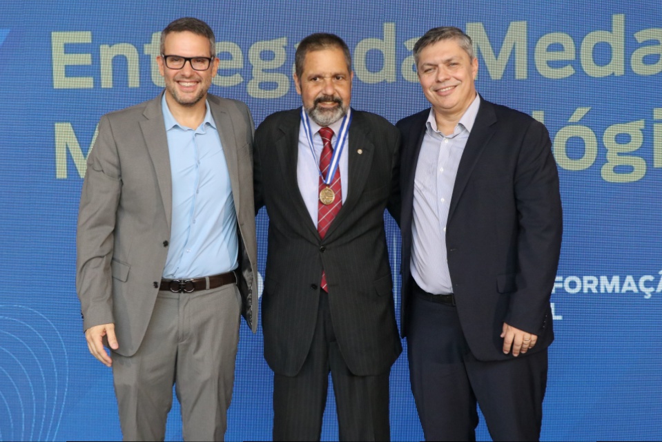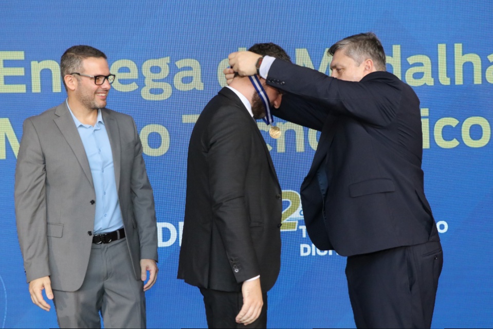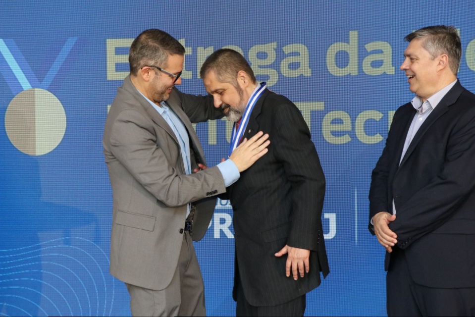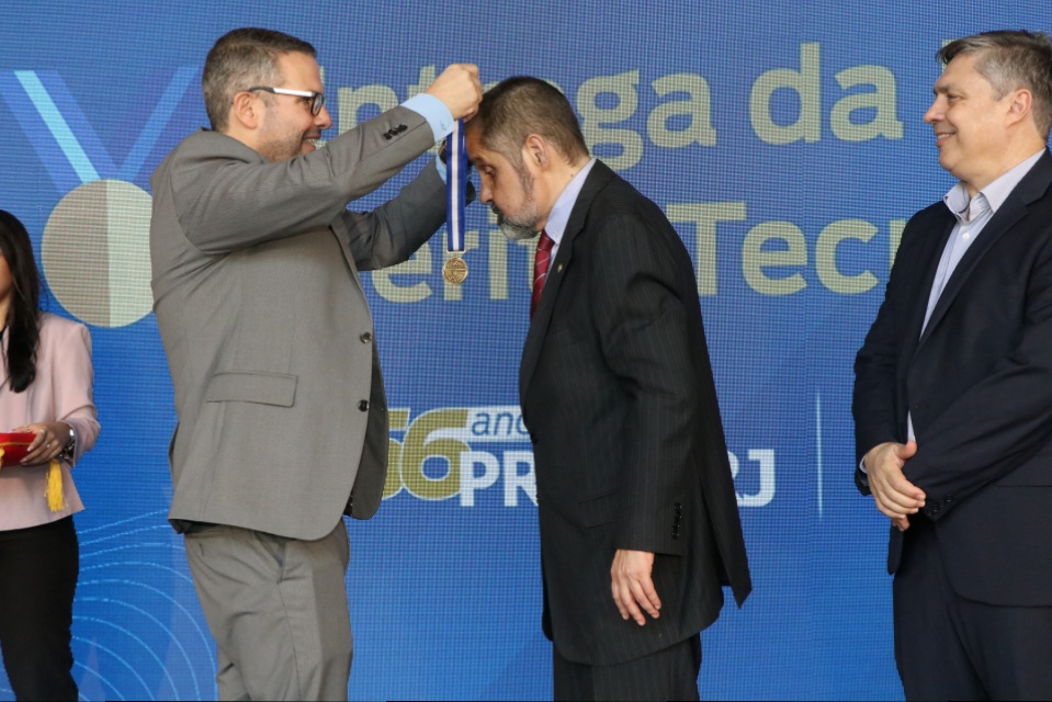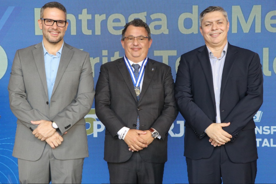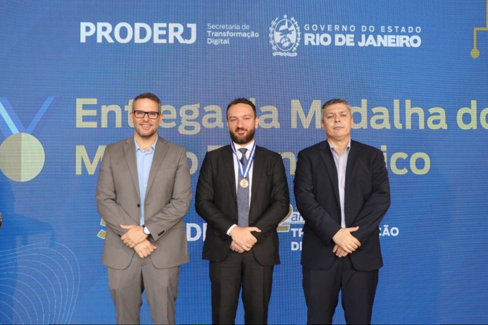 O Procurador-Geral do Estado, Renan Miguel Saad, e os Procuradores Denis Moreira Monassa Martins e Leonardo Azeredo dos Santos, foram homenageados, nesta sexta-feira (05/07), pela Secretaria de Estado de Transformação Digital com a outorga da Medalha do Mérito Tecnológico, por ocasião das comemorações pelos 56 anos do Centro de Tecnologia de Informação e Comunicação do Estado do Rio de Janeiro (Proderj).