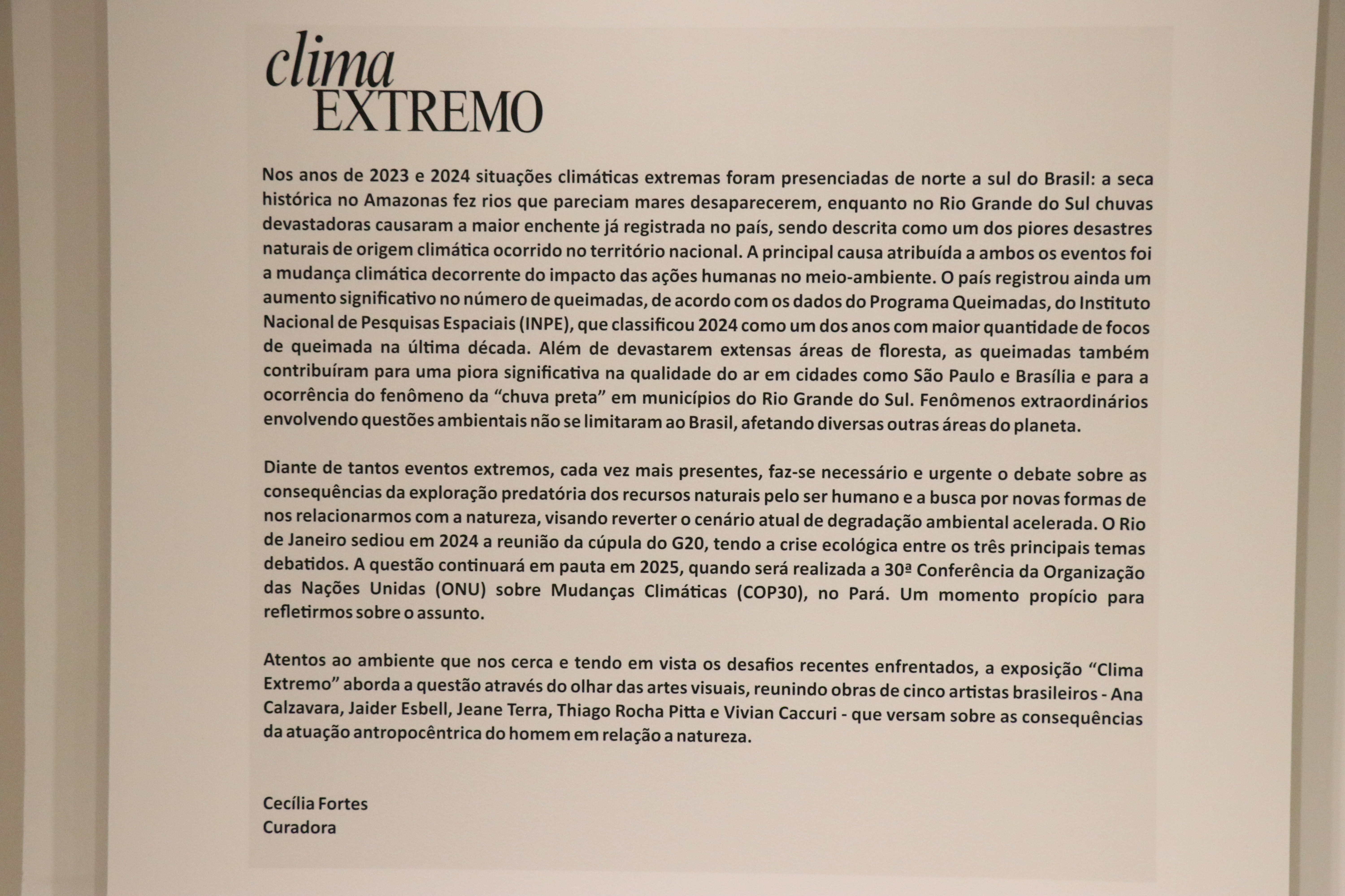 Com curadoria de Cecília Fortes, a exposição apresenta obras que visam estimular a busca por novas formas de interação com a natureza e o meio ambiente. "Clima Extremo" busca alertar também a humanidade sobre a degradação ambiental que tem ocorrido nos últimos anos, quando foram registradas secas históricas, queimadas de grandes áreas verdes e enchentes.